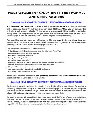 Read holt mcdougal geometry chapter 11 test Epub online is a convenient and frugal way to read holt mcdougal geometry chapter 11 test you love right from the comfort of your own home. Yes, there sites where you can get Epub "for free" but the ones listed below are clean from viruses and completely legal to use.